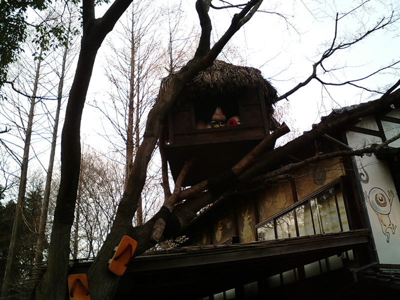 ということはなく、上の左側の写真のとおり、屋根に下駄がのっていたり、壁に妖怪の絵が書いてある以外はまわりの雰囲気とさほと違和感はないので、