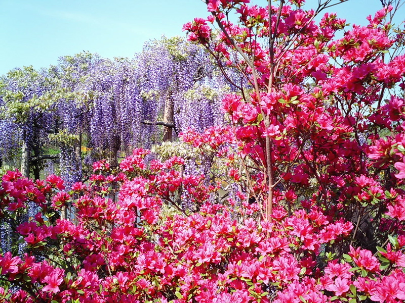 藤棚が名物のところは藤の紫色だけになりがちですが、ここはツツジの赤と藤の紫の組み合わせが楽しめますo(^-^)o