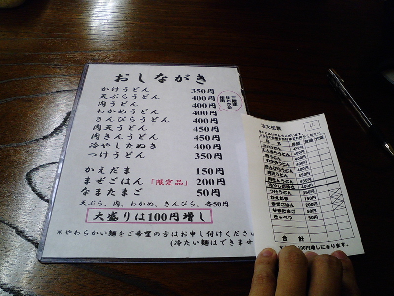 僕は『肉うどん』を、奥様は『肉天うどん』を注文することになり、注文表に『肉うどん』の普通に「1」、『肉天うどん』の普通に「1」を書き込んで、レジの方に持って行きました。