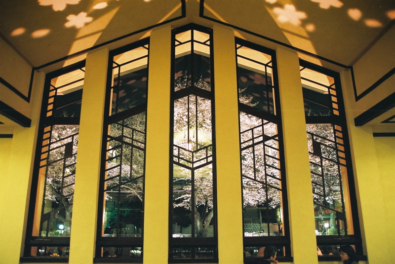 建物の中からも、ステンドグラス風にデザインされた窓越しに夜桜を楽しむことが出来ます。