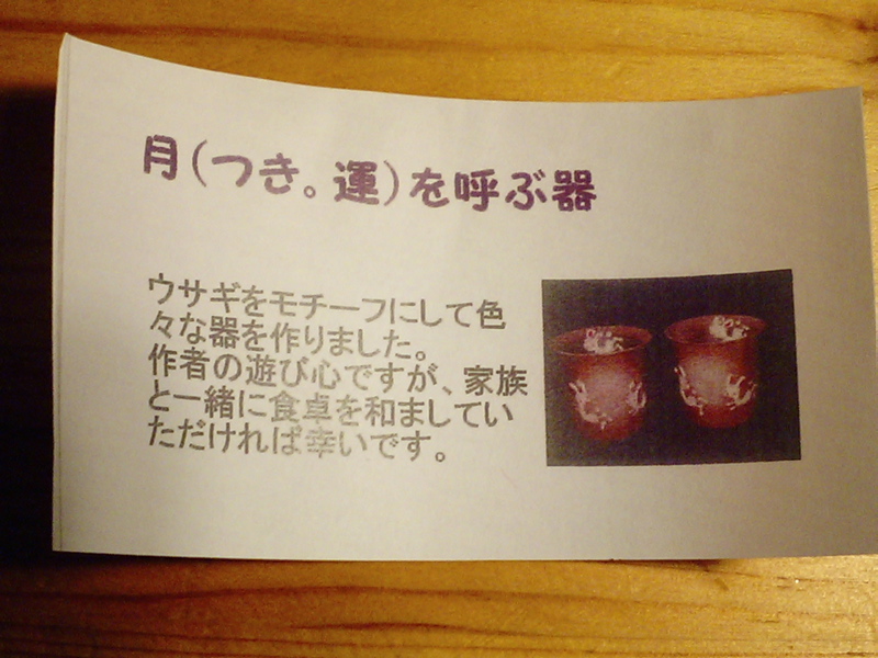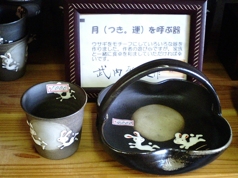 うさぎというより、一緒に描かれている月がツキを呼ぶってことみたいですが、実際にこのデザインの食器を買って幸福になれた方が何人もいるそうです、店主さん曰く。