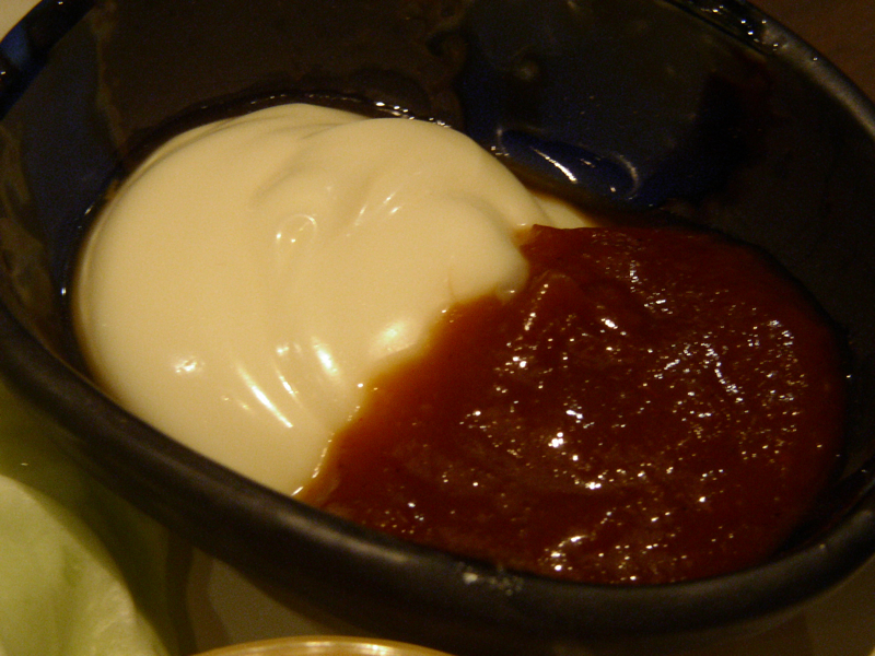 ソースは「特製マヨネーズ」「サンチュ味噌」「にんにく塩ダレ」の3種類。
