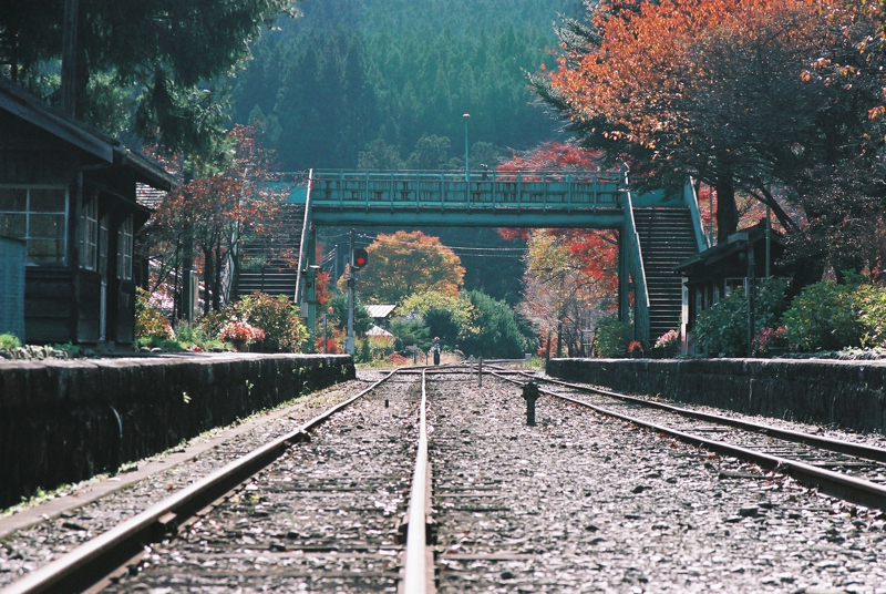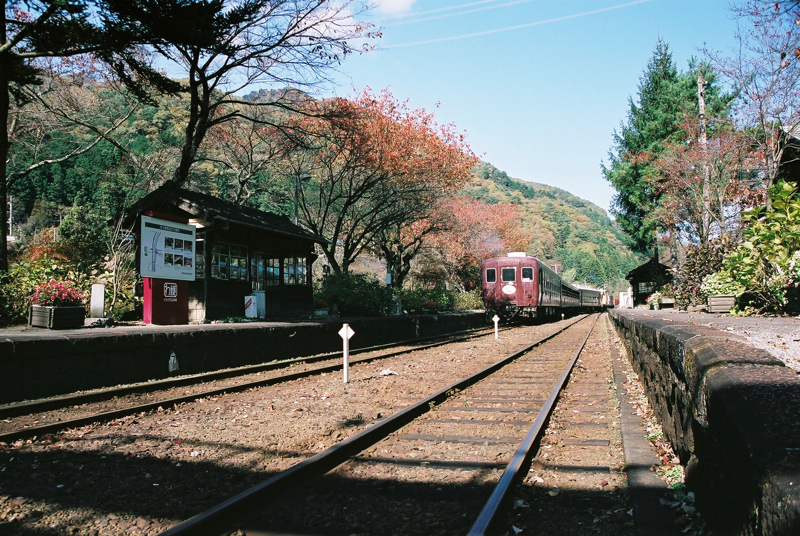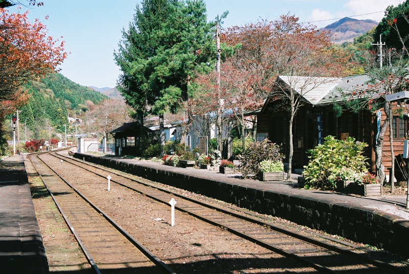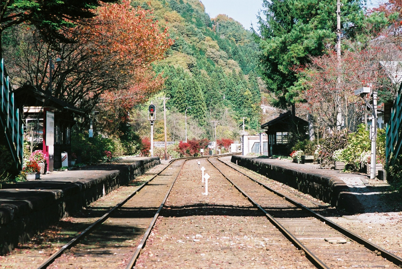 色鮮やかとまではいかない紅葉ですが、のんびりとしたローカルな駅とあいまって秋らしい1コマの景色になっていました。