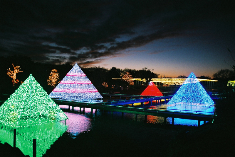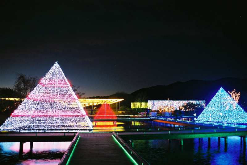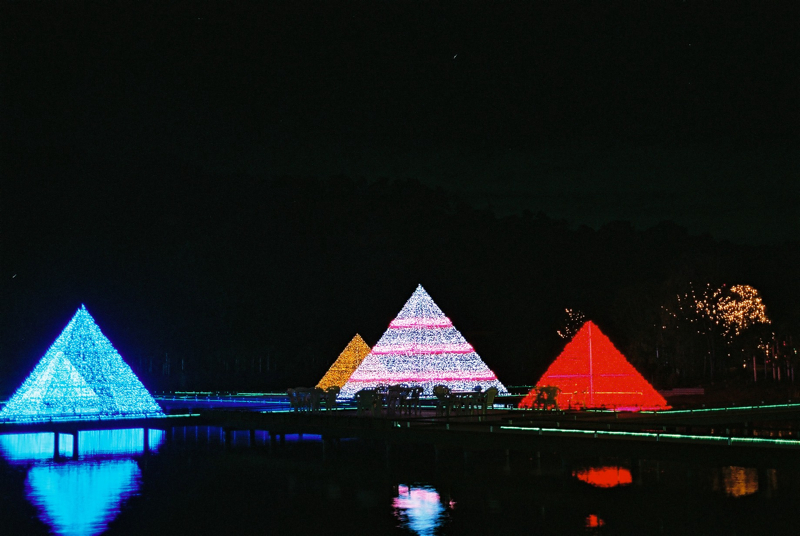池の中に大小5つの光るピラミッドが作られ、さらに池を横断するように橋が渡されいるので、橋を歩きながら、いろんな角度から光るピラミッドを楽しむことが出来ます(^-^)
