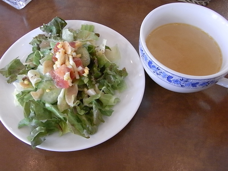 注文後すぐに、サラダとスープの前菜が登場(^-^)