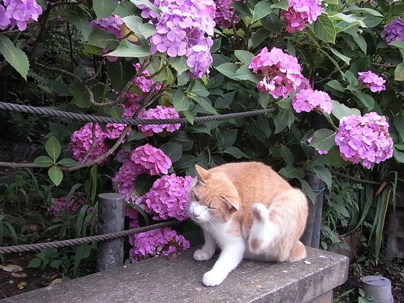お寺を寝床(?)にしている猫の周りも紫陽花(^-^)