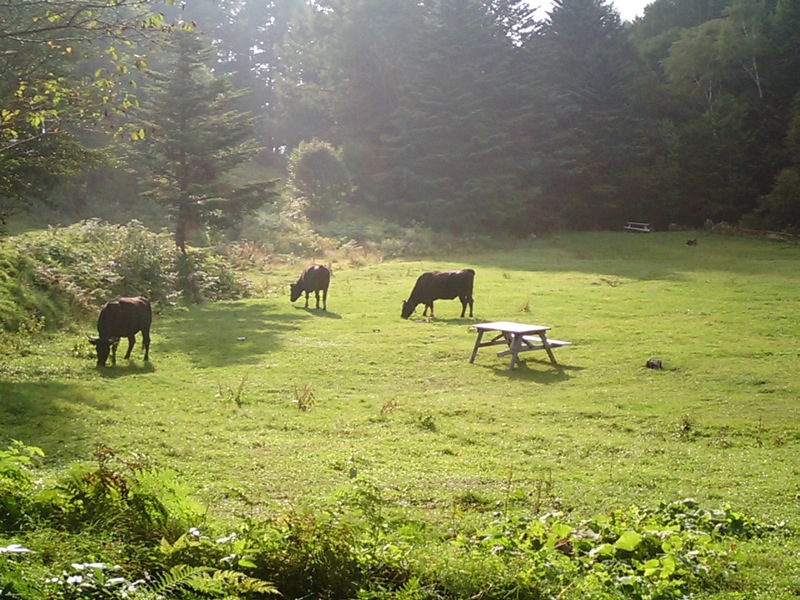 困っていたら、夕暮れ時になり、夜は牧舎で寝るらしく、牧舎の方へと牛たちが歩き出して、なんとかキャンプサイトから牛を追い出し成功(というか、勝手に牛が出ていったんですが...)。