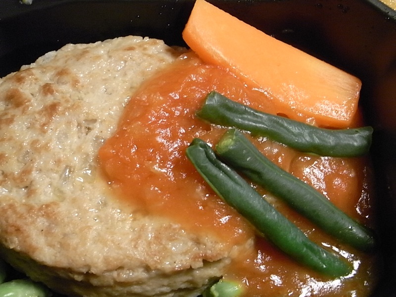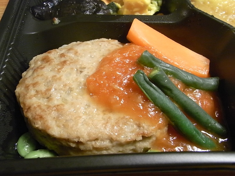 まずハンバーグを食べてみると、他の2つの食材(『酢豚』と『豚のしょうが焼き』)と同様に薄味仕上げであるものの、お肉の味がしっかり出てて、なかなか美味しい(^o^)