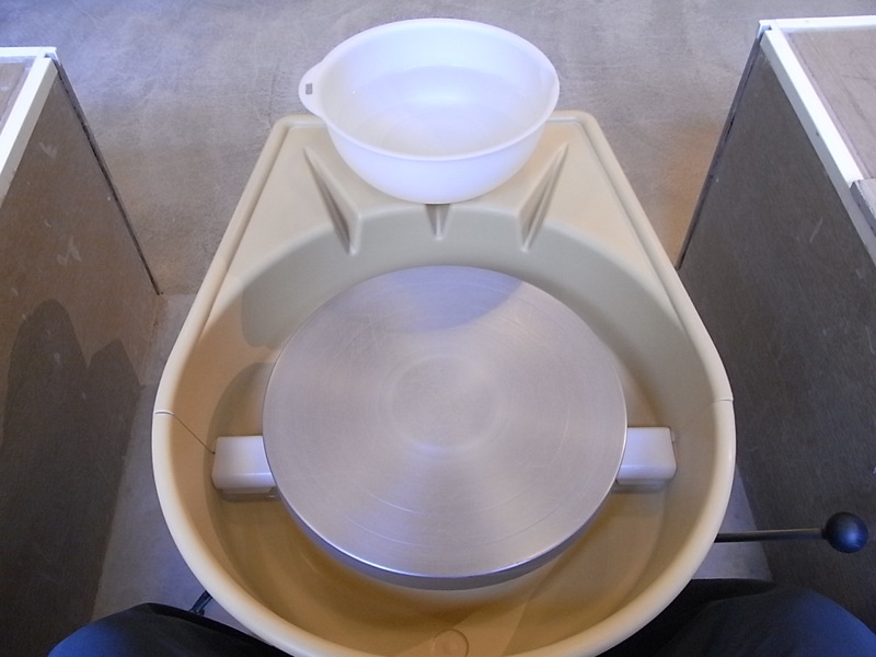 手前にろくろ、奥に手を濡らす水が入ったボウル。