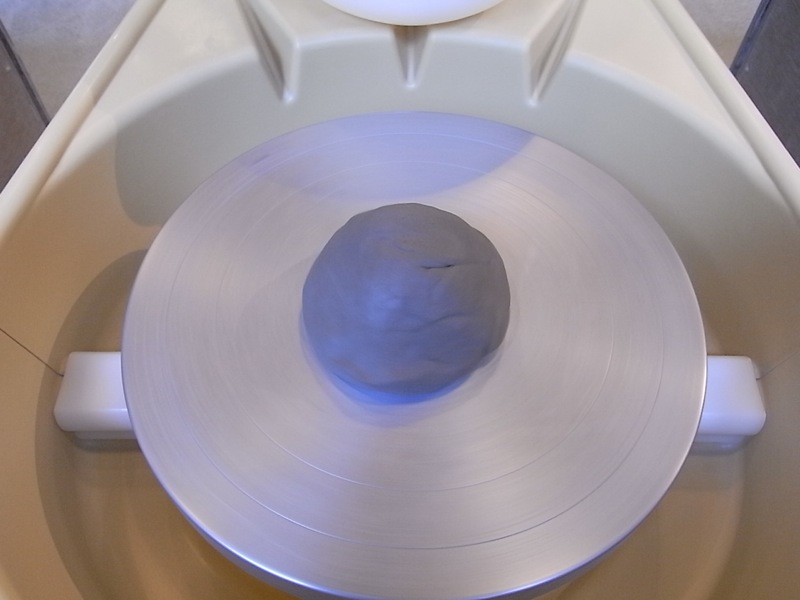 おにぎりのように丸めたら、ろくろの中心に押し付けて固定します。