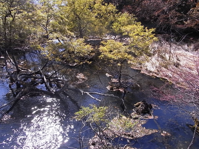 湯ノ湖の水は、水遊びをするのに良さ気な、こんな穏やかな水辺を通って、