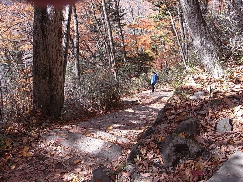 途中、湯滝の激流やもみじを見つつ