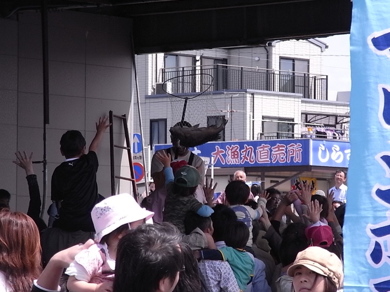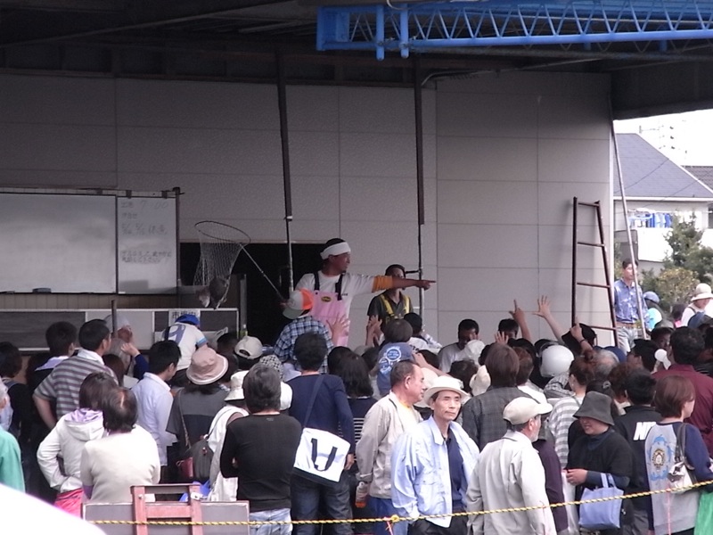も、行列に並んでいるのでセリには参加できず、遠目で楽しそうな風景を眺めているだけ(TωT)