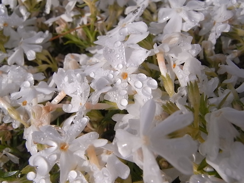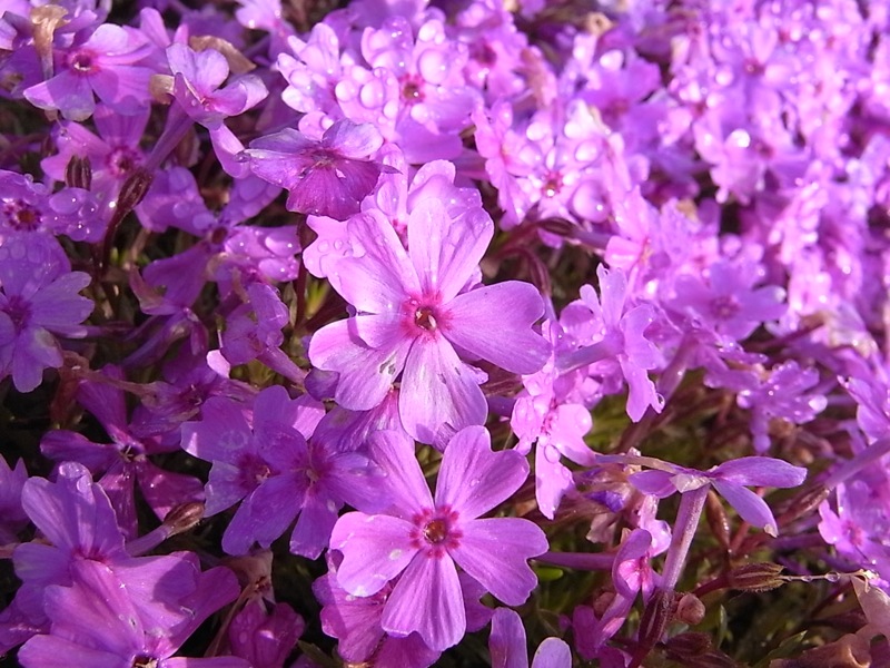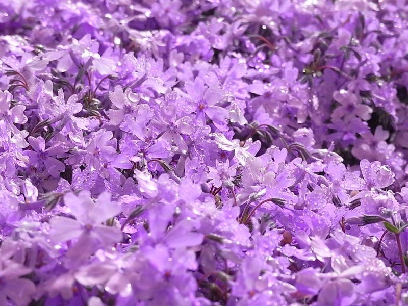 朝7時なので、まだ芝桜に夜露が残っていて、朝日に光輝き、
