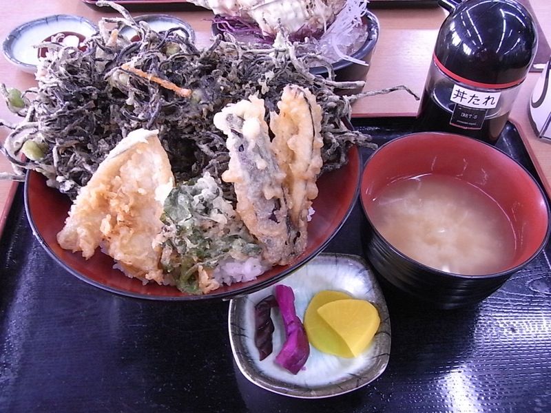どんぶりにはみ出さんばかりにのっている黒い物体が、ひじきの天ぷら。