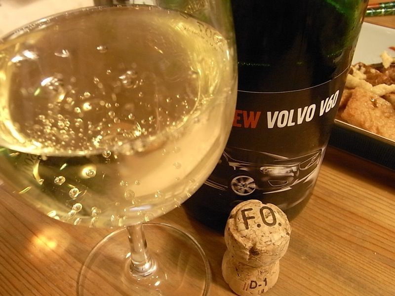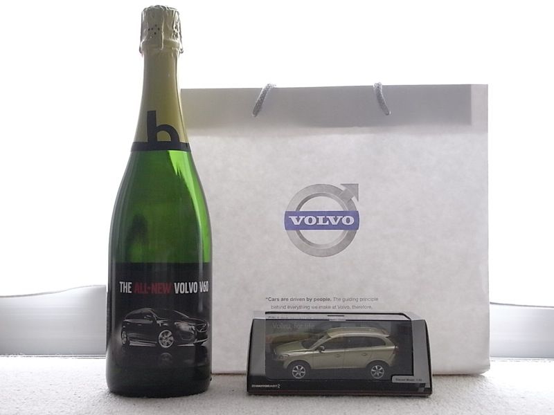 ボルボのミニカーと、ボルボのラベルがついたスパークリングワイン。