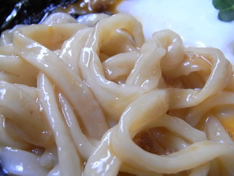 適度なコシと柔らかな食感のうどんが、肉みそとたまごとよく絡んで絶品の美味しさに。