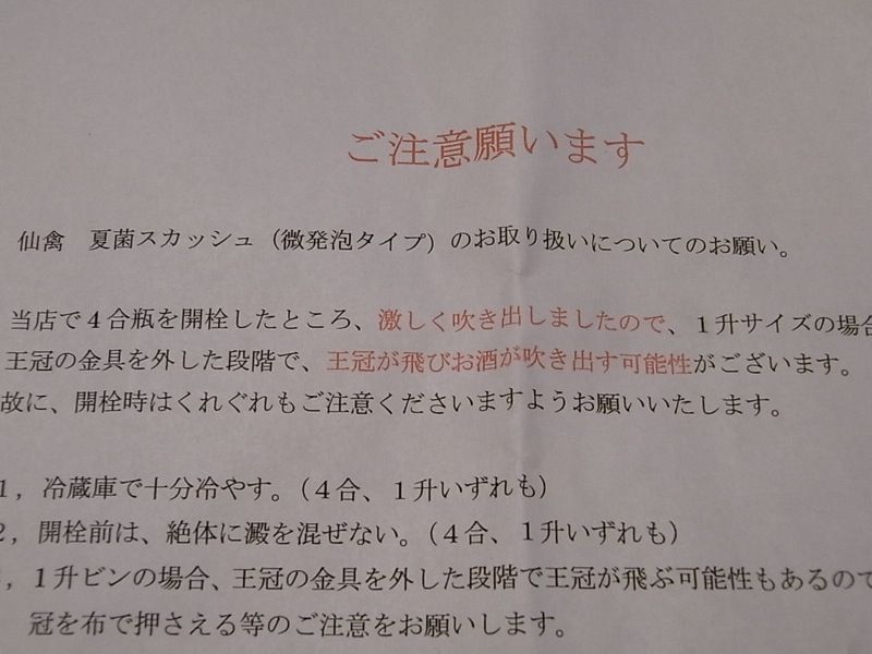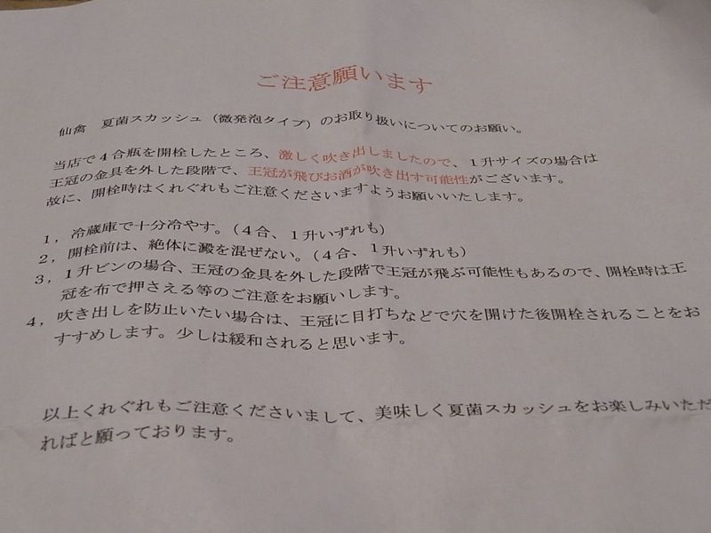その中でお目当ての『夏菌スカッシュ』を見つけ買おうとしたら、開栓の注意書きをいただいた上に、