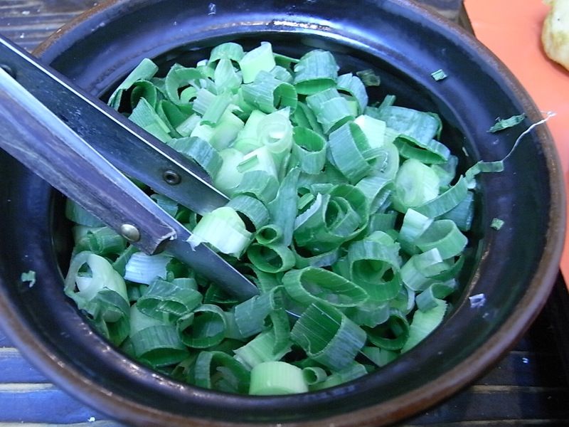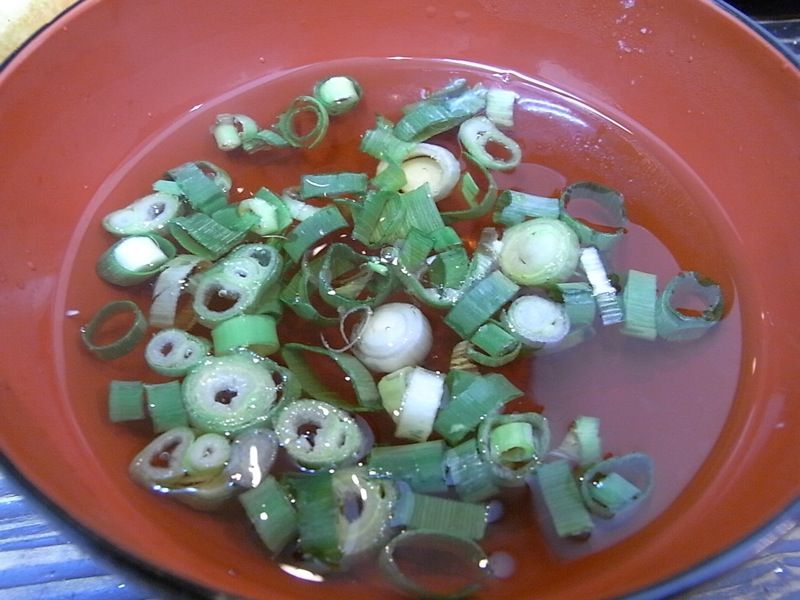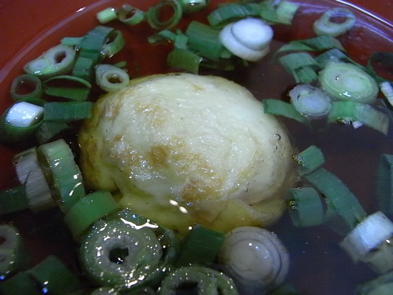 ダシにネギを入れて、明石焼きをつけて食べてみると、