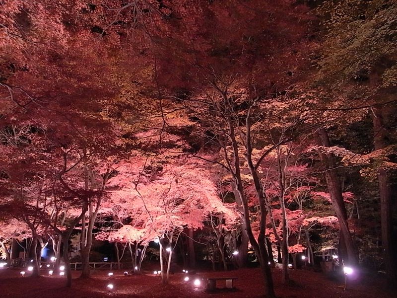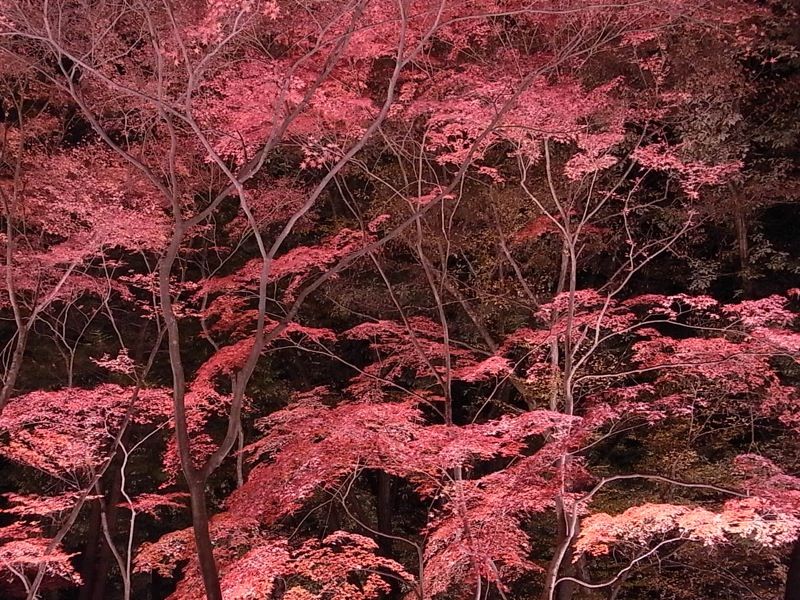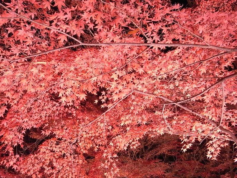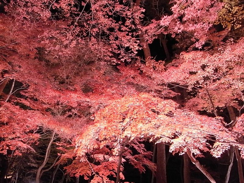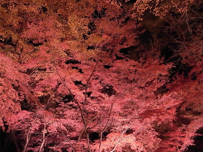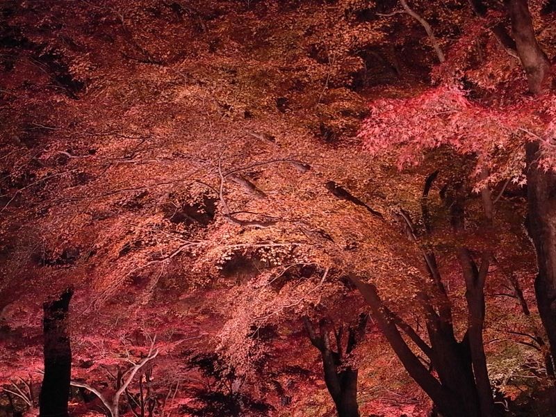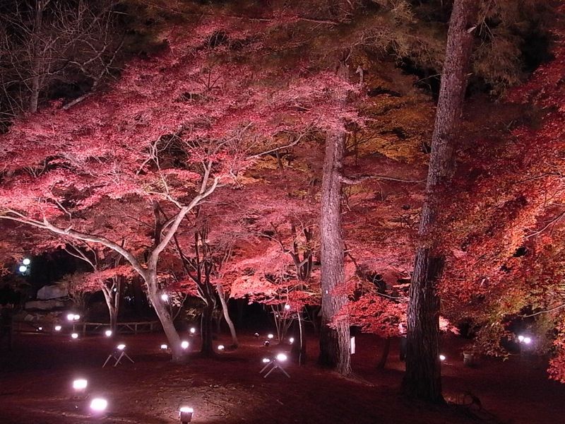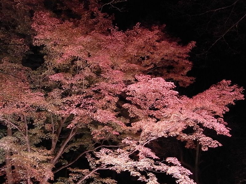 紅葉度合いは決していいとはいえないものの、下からライトを照らされた紅葉は、