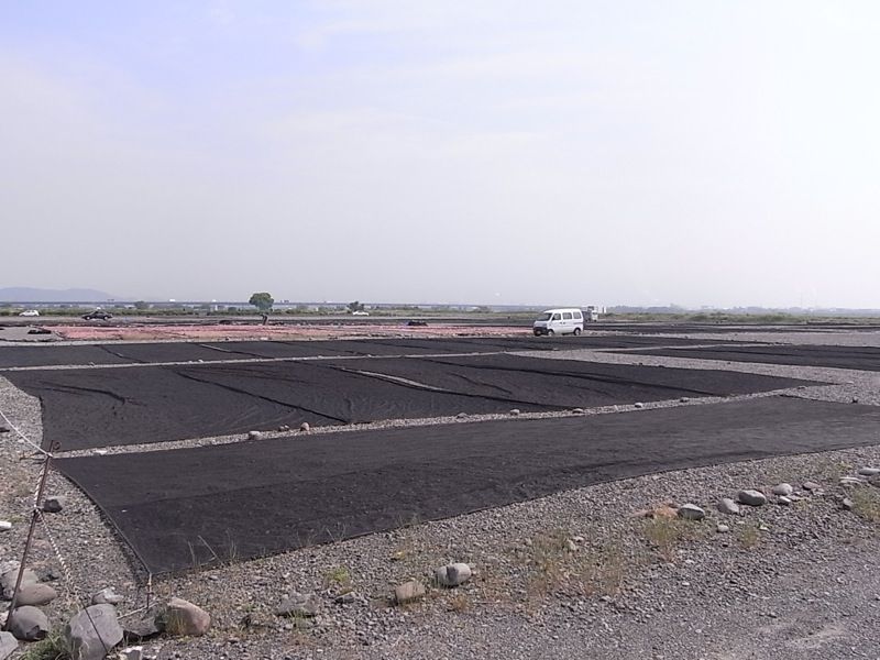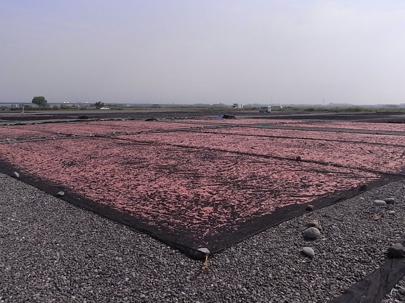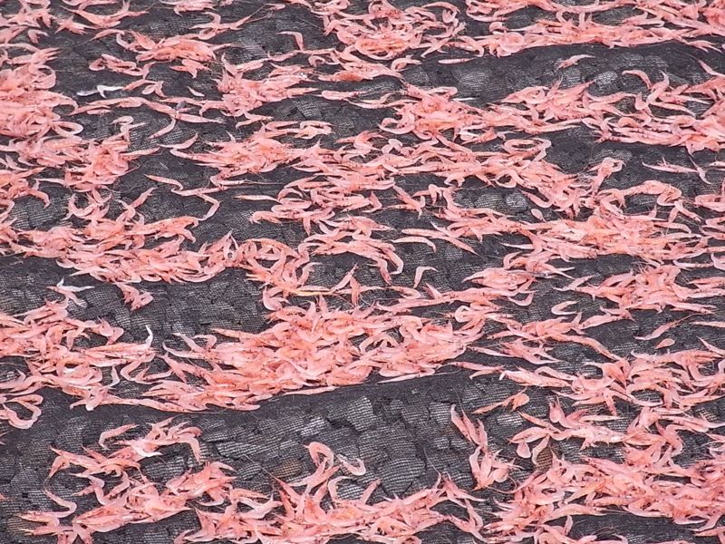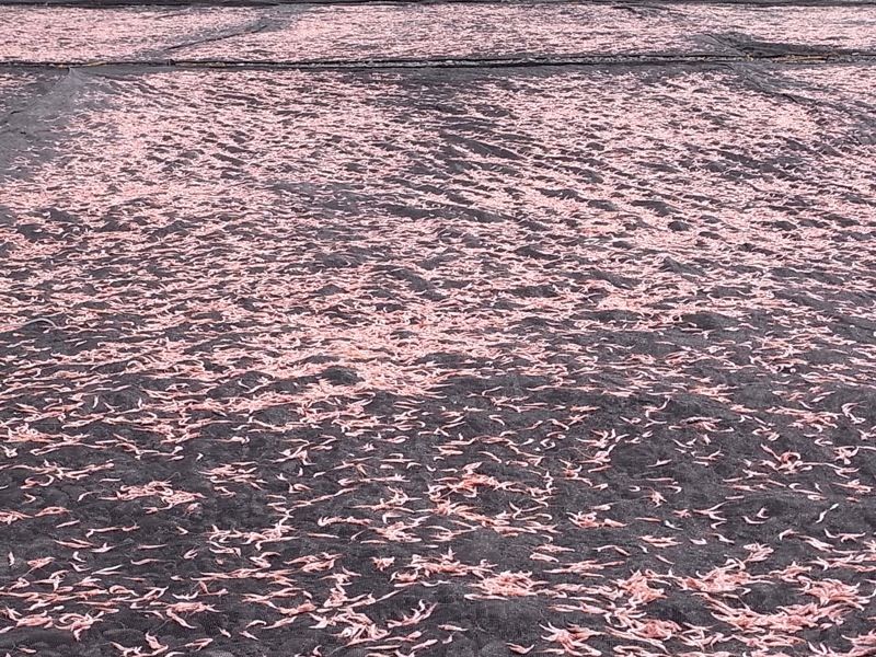天日干しは河原の砂利の上に黒い網が敷かれ、網の上にまかれるように桜えびが干されてます。