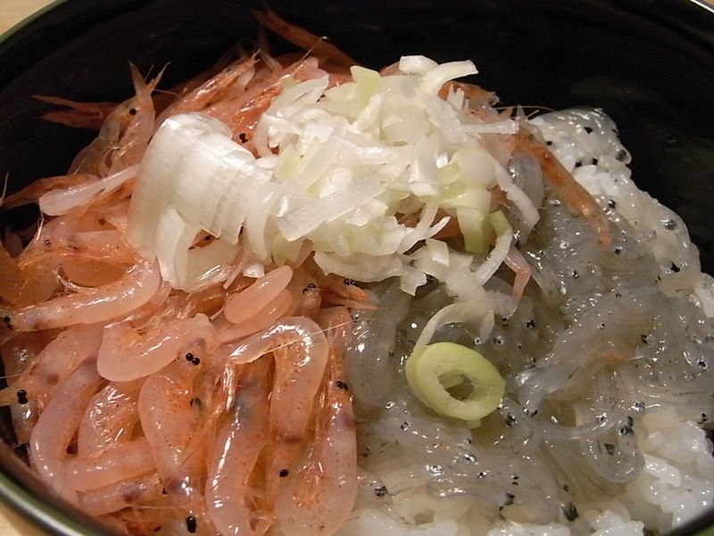 そんな釜揚げしらす丼にさっき買った生桜えびをのせて