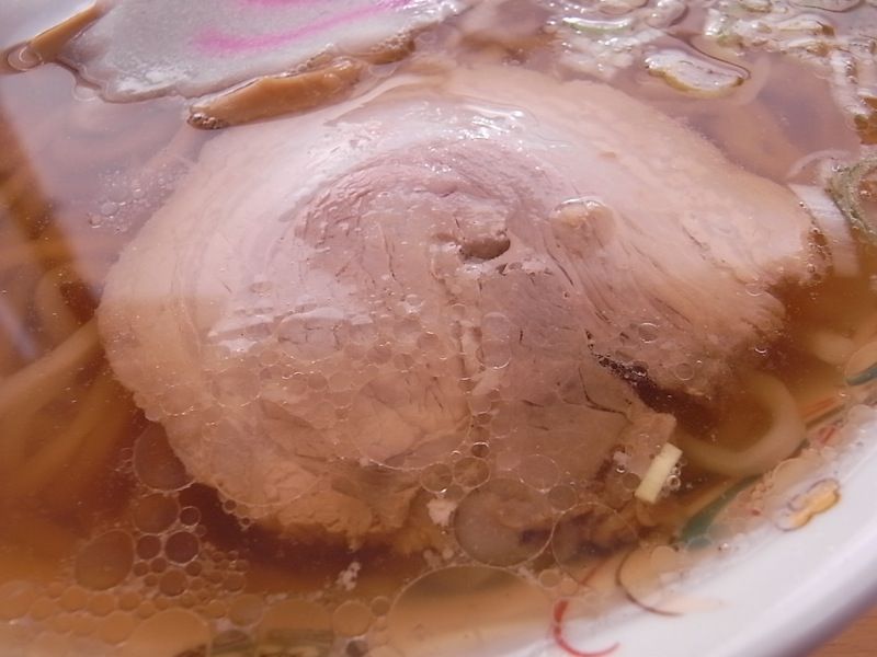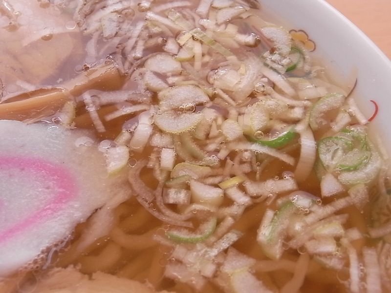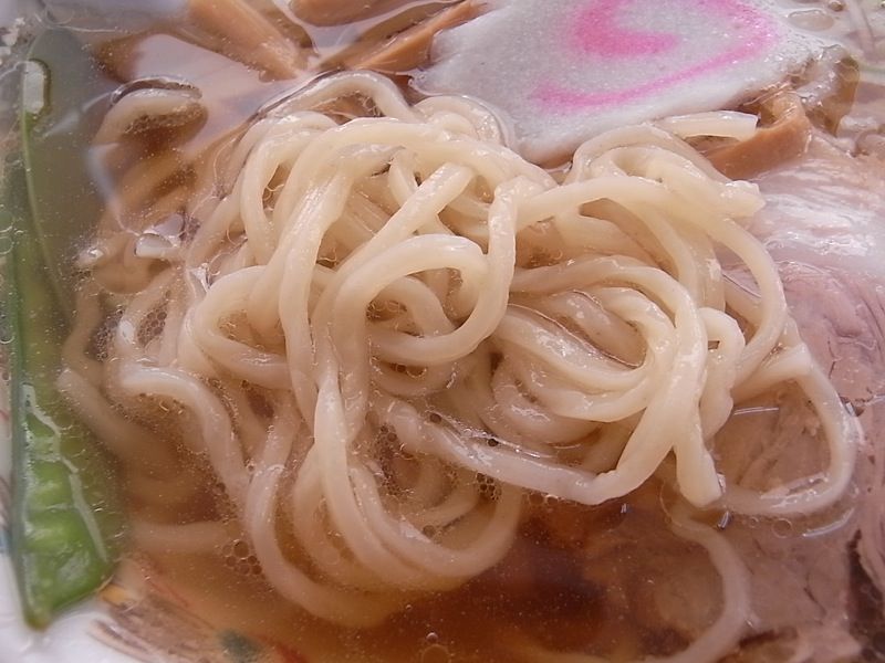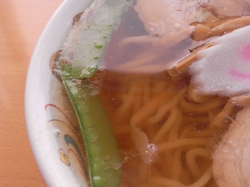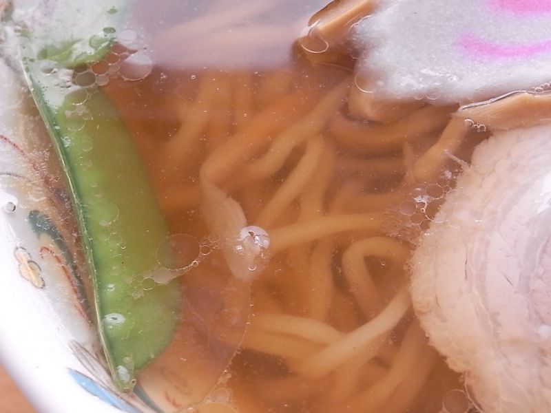 見た目通りの薄めな味のスープは、クセがまったく感じられず、油もさほど浮いていないので、スッキリサッパリした好感のもてるスープ。