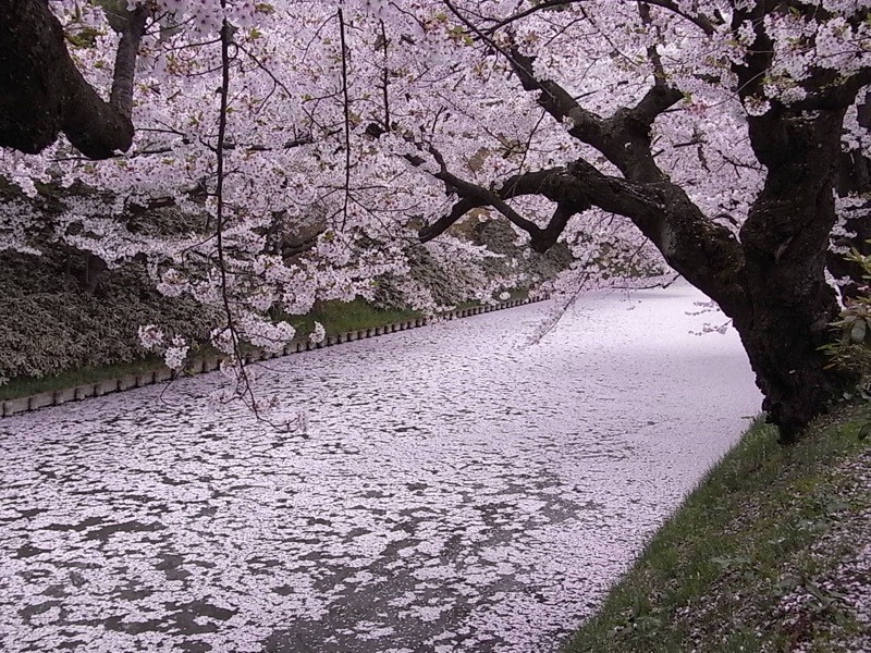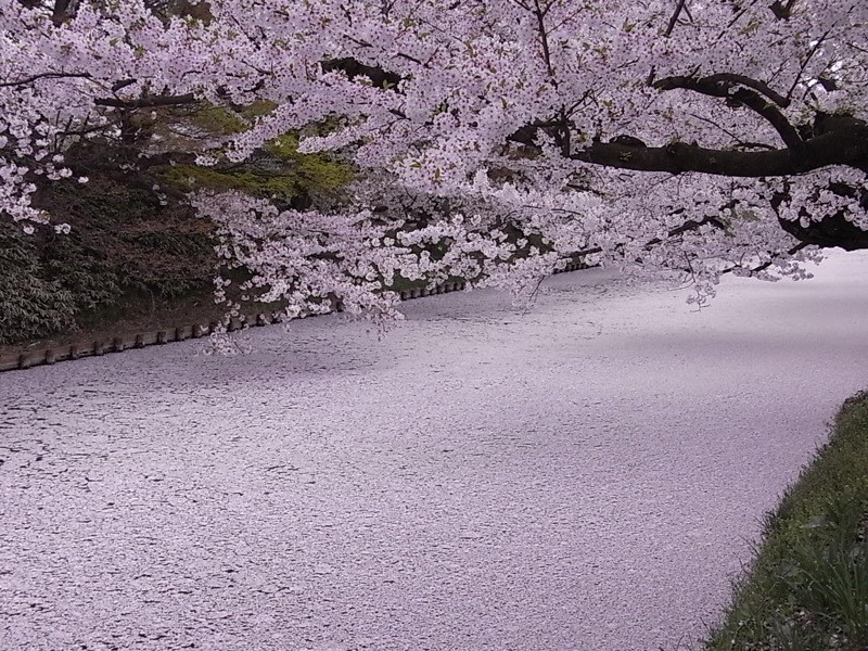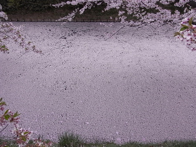 すっかりお堀一面を散った桜の花びらで覆う尽くされてしまい