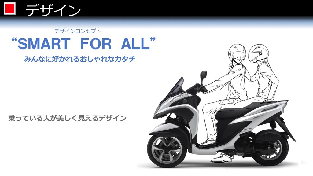 “3輪バイク”というと“ピザ屋のバイク”みたいなダサいイメージを想像しがちなところを、デザインをカッコよくまとめ、“ピザ屋のバイク”イメージを払拭しているところにもヤマハ“らしさ”を感じます。
