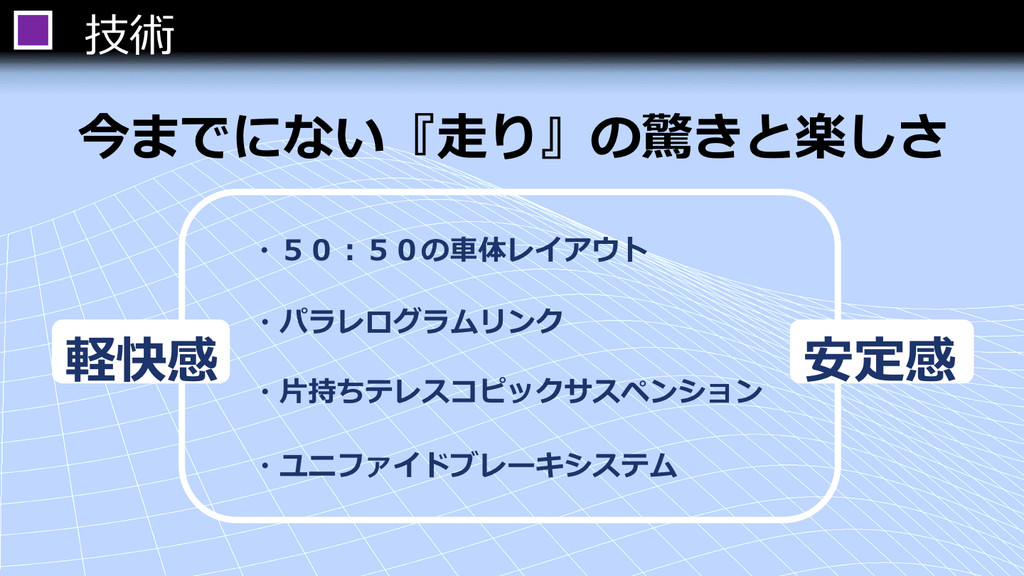 今までにない走りの驚き、楽しさを創り出す軽快感と安定感、それらを実現するための独自技術です。