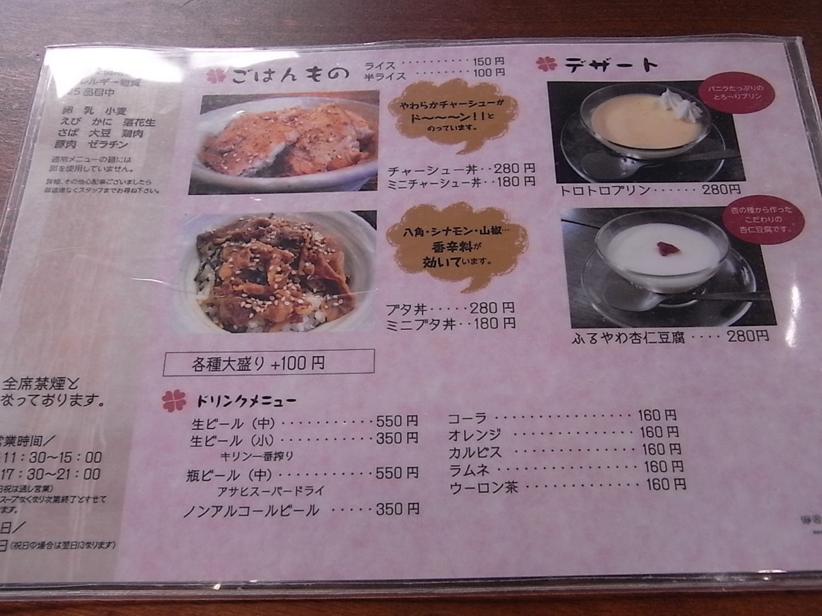 店内に入り、お座敷席に座り、メニューを見ると