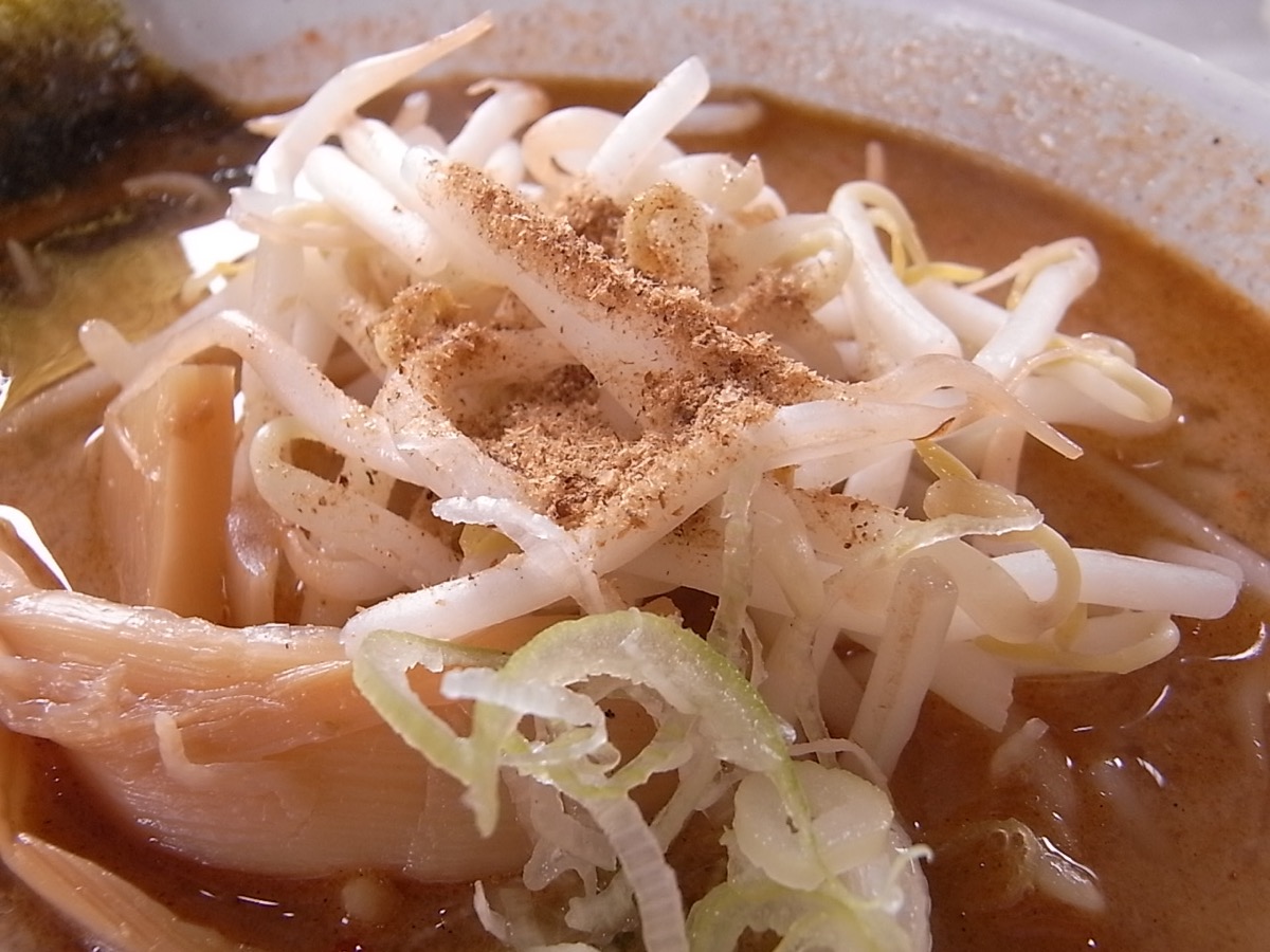 シナチク、もやし、刻みネギ、海苔と味噌ラーメンとしては普通なトッピングたち